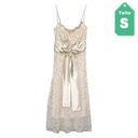 Vestido de tirantes ajustables en tela poliester y encaje, de color marfil y cinta para realizar lazo en la parte frontal.