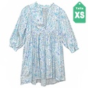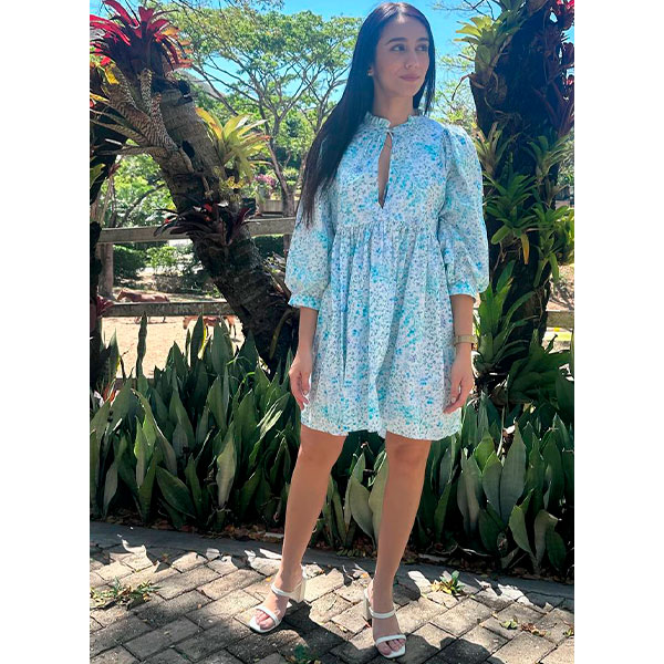 Vestido holgado de mangas largas en tela de algodon y poliester, de color azul cielo con diseño estampado floral ( azul claro, turquesa y blanco), de cuello descubierto y cintas para enlazado.