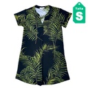 Vestido manga corta en tela poliester y spandex, de color negro con estampado de palmas de color verde.